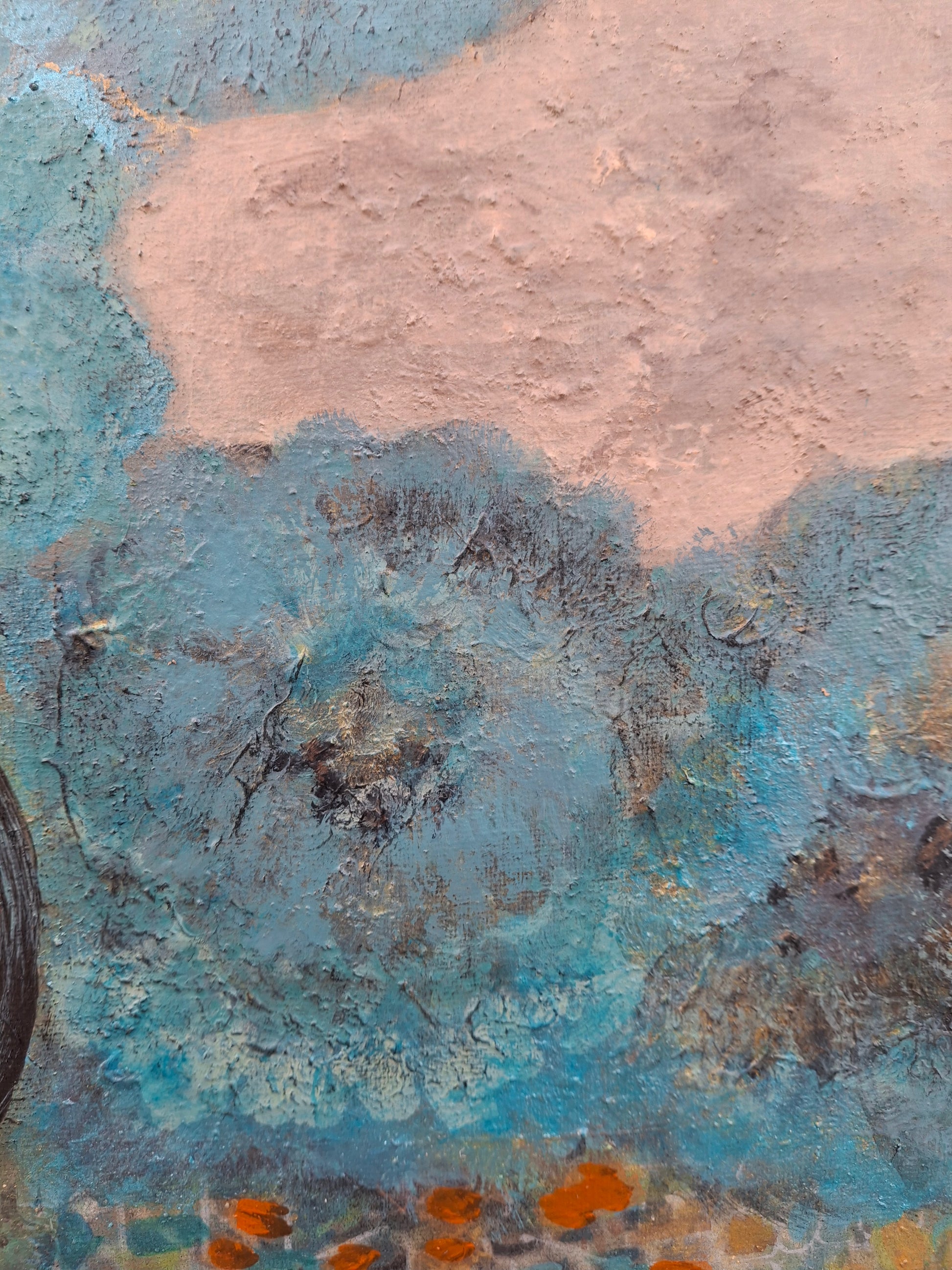 The painting technique reinforces this statement: layer over layer with texture paint, intuitively built. The texture carries the image, as character carries a posture.