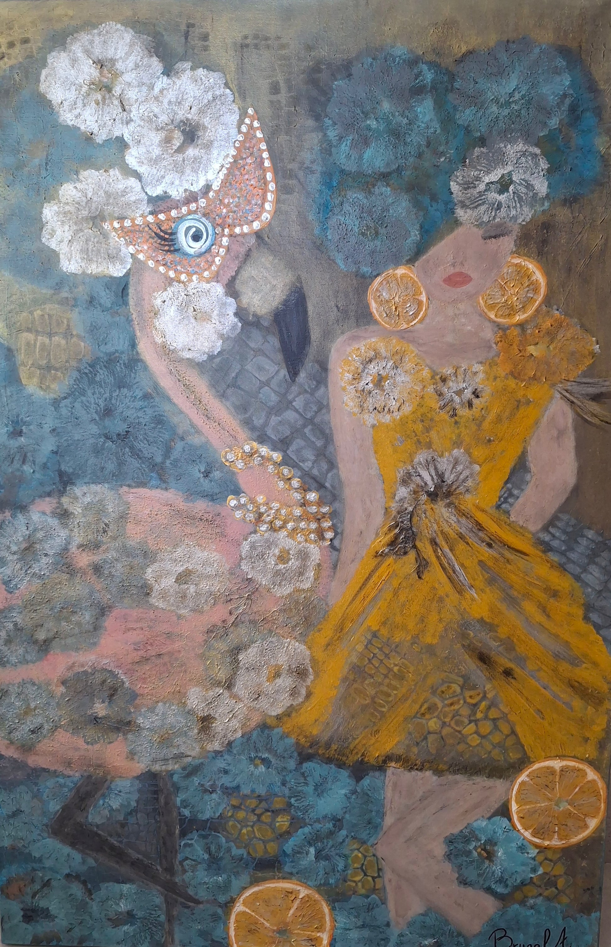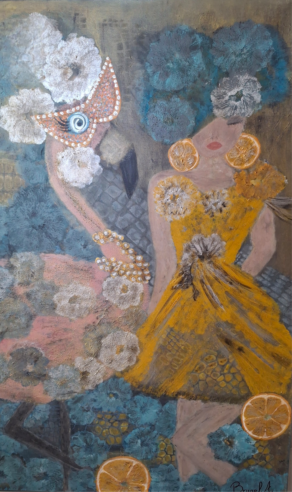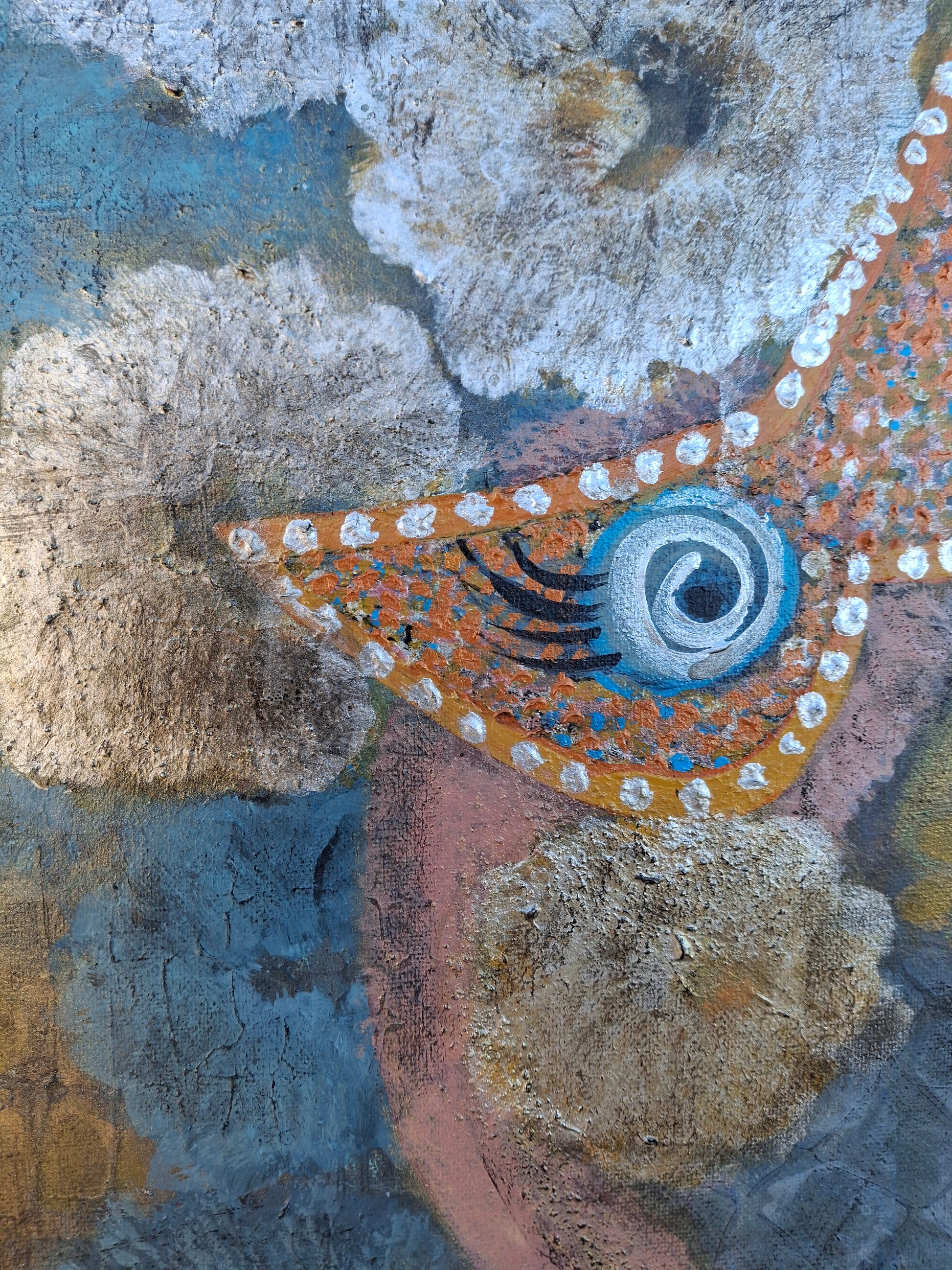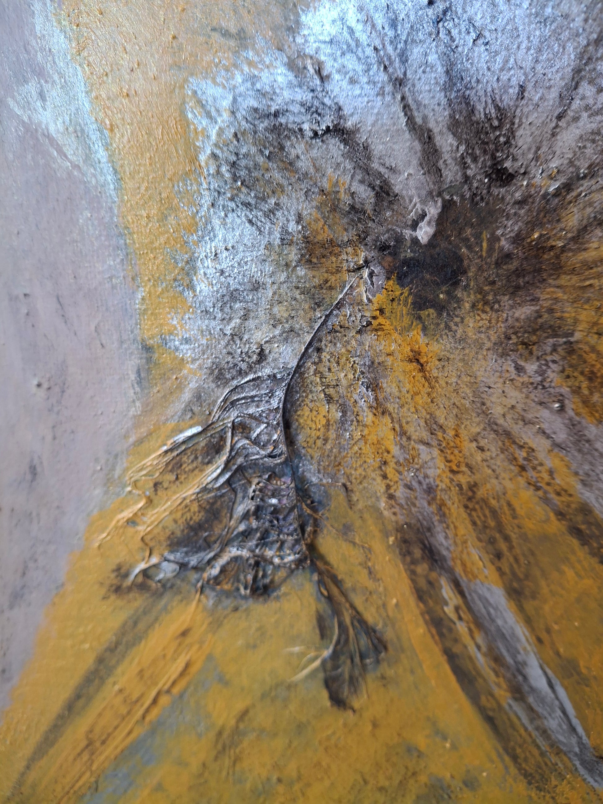 The background is built up in layers of acrylic paint, applied intuitively. Tthe spray paint adds breath and movement. The result is not decoration, but a statement: about posture, about place, about the moment when everything comes together.